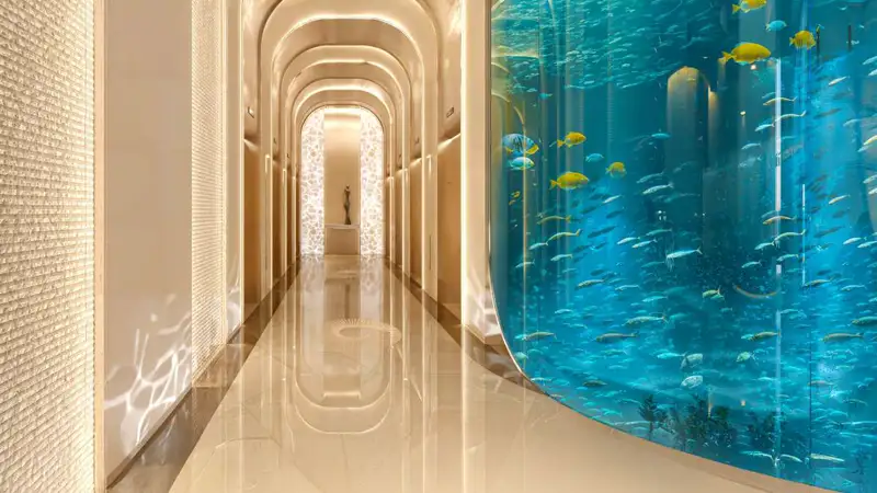 Resort-style amenities including a 1,500 sq. ft. aquarium, waterfall atrium, and luxury communal spaces.